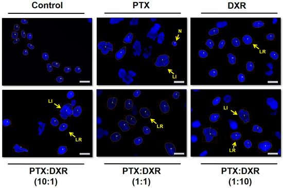 Fluorescence photomicrographs of MDA-MB-231 cell line nuclei stained with Hoescht 33342 after different treatments at concentration of 70 nM for 48 h. Some of the different nuclei morphometric phenotypes observed are indicated. Images are representative of three independent experiments. Amplification 40×, scale bar = 20 μm. Abbreviations: DXR, doxorubicin; PTX, paclitaxel; N, normal; LI, large irregular; LR, large regular.