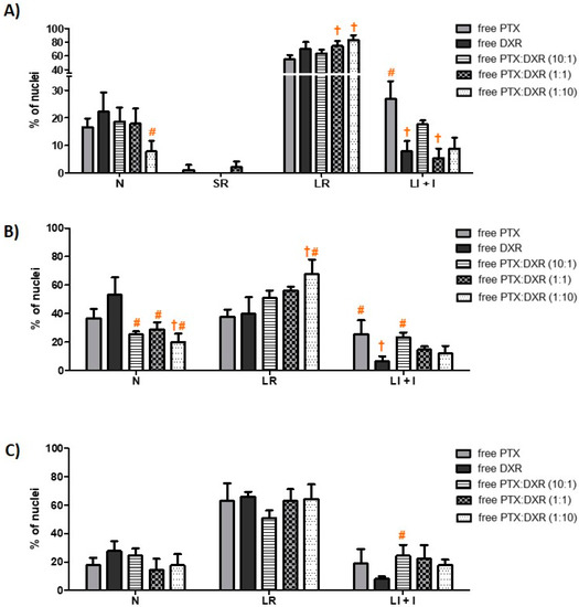 Nuclear morphometric distribution of MDA-MB-231 (A), MCF-7 (B) and SKBR-3 (C) cell line nuclei exposed to 70 nM of different treatments for 48 h. Data shown represent the mean ± SD of three independent experiments. † = differs statistically from the PTX treatment; # = differs statistically from the DXR treatment. Data for MDA-MB-231 and MCF-7 cell lines were transformed as y = square root(value) and for SKBR-3 cell line as y = log(value) prior to perform ANOVA (P < 0.05). Ratio in parenthesis refers to PTX:DXR molar ratio. Abbreviations: DXR, doxorubicin; PTX, paclitaxel; LI + I, large irregular plus irregular; LR, large regular; N, normal; SR, small regular.