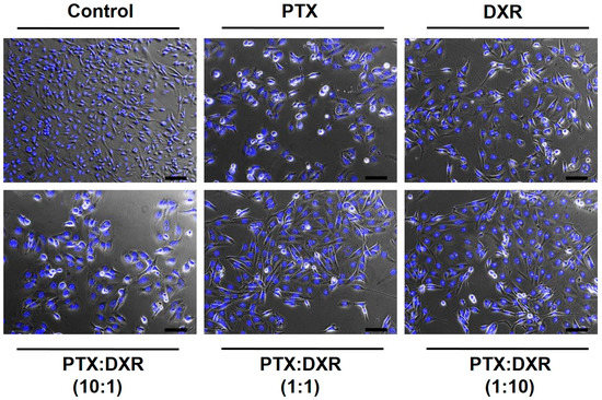 Merge of phase-contrast and fluorescence photomicrographs of MDA-MB-231 cell line after different treatments at concentration of 70 nM for 48 h. In the control group, cell shapes were intact and with higher density. On all treated groups, it was observed enlarged and flattened cells, matching the phenotypic morphology of senescence. Round cells, characteristic of mitotic arrest can be observed on groups treated with PTX and PTX:DXR at 10:1 molar ratio. Nuclei were stained with Hoescht 33342. Images are representative of three independent experiments. Amplification 10×, scale bar = 100 μm. Abbreviations: DXR, doxorubicin; PTX, paclitaxel.