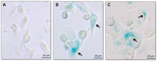 Bright field photomicrographs of MDA-MB-231 cell line of the control group (A) or after treatments with PTX (B) and DXR (C) at a concentration of 70 nM for 48 h. On treated groups, cells are larger and were positively stained for SA-β-gal as indicated by arrows, confirming the occurrence of senescence. Amplification 40×.
