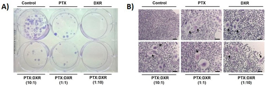 Colonies formed 21 days after re-plating MDA-MB-231 cells previously exposed to 70 nM of different treatments for 48 h. Photograph of plate containing colonies (A) and photomicrographs of crystal violet stained colonies, amplification 10×, scale bar = 100 μm. Arrows indicate cells reassuming the senescence morphology (B). Abbreviations: DXR, doxorubicin; PTX, paclitaxel. Ratio in parenthesis refers to PTX:DXR molar ratio.