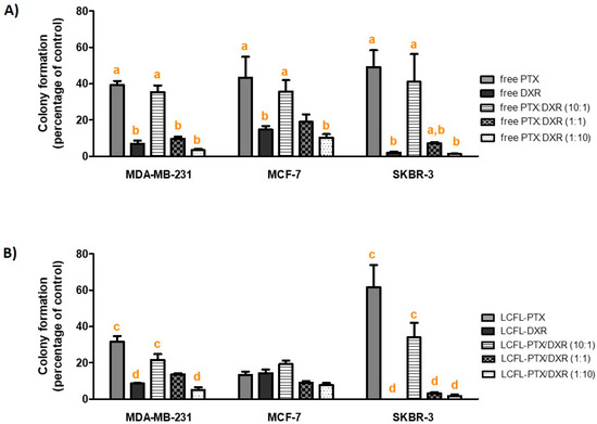 Clonogenic assay was performed based on one of the protocols described by Franken and coworkers (2006) [29]. MDA-MB-231, MCF-7 and SKBR-3 cells were plated on a density of 2.5 × 105 cells/well in 6-well plates and incubated at 37 °C for 24 h. After incubation time, cells were treated for 48 h with 2 mL of different treatments (PTX, DXR, the mixtures of free PTX:DXR at 10:1; 1:1 or 1:10 molar ratio, LCFL-PTX, LCFL-DXR, or LCFL-PTX/DXR co-encapsulating different fixed molar ratios of 10:1; 1:1 or 1:10) all at a total concentration of 70 nM. Control wells received 2 mL of fresh media. Then, cells were harvested and counted. Different densities of viable cells (300 cells for MDA-MB-231 or MCF-7 cell lines and 900 cells for SKBR-3 cell line) were re-plated in 6 well plates to evaluate the ability of the remaining cells to form colonies. Twenty-one days after re-plating, colonies were fixed with formaldehyde 4% for 10 min and stained with 2 mL of crystal violet for 1 hour. Colonies, consisting of a group of at least 50 cells, were counted using an AxioVert 25 (Zeiss, Oberkochen, Germany) microscope, and the percentage of colony formation relative to the control was calculated for each group.
