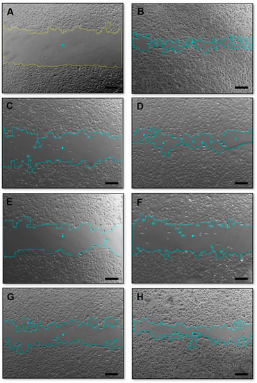 The wound healing assay allows the observation of two-dimensional (2D) cell migration in confluent, monolayer cell cultures [41]. When performing migration assays, it is important to guarantee that the wound closures are due to the cell migration and not proliferation. Therefore, experiments in this work were performed in lower FBS concentration (1%), a procedure known as cell starvation, which suppresses cellular proliferation [42]. In addition, the wound closures were evaluated 24 h after exposure to the different treatments once longer study periods do not allow distinguishing between cell proliferation and changes in cell survival from cell motility [43]. Representative phase-contrast photomicrographs of the scratches after 24 h exposure to the treatments are presented in Figure 7.