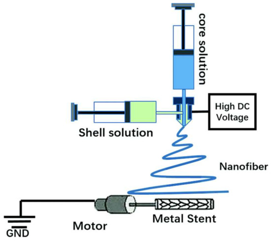 Intracranial aneurysms represent one of the most common cerebrovascular diseases, and they cause serious healthcare problems, such as brain damage, hemorrhagic stroke, and even death [33,34]. Many studies demonstrated that a covered stent is a desirable solution to treat aneurysms [35,36]. However, the common problem is that the stent-graft easily causes platelet aggregation when implanted into the blood vessel, leading to thrombosis and intimal hyperplasia. Rapid endothelialization, antithrombotic coatings, and anti-clotting drugs are favorable methods to avoid thrombosis. A covered stent is formed by a covered sheet wrapping a metallic stent, where the anticoagulation properties of the covered sheet play a crucial role in avoiding thrombosis of the covered stent. The emulsion electrospinning technique was used to fabricate heparin-loaded poly(l-lactide-co-caprolactone) (PLCL) core–shell nanofibers as an anticoagulant cover sheet. Heparin aqueous solution and emulsifier Span-80 were added dropwise into dichloromethane while stirring until a uniform water-in-oil emulsion formed. PLCL was then added into the emulsion for electrospinning to fabricate PLCL/heparin core–shell nanofibers. The covered stent effectively separated the aneurysm dome in the bloodstream of the rabbit model [37]. In addition, vascular endothelial growth factor (VEGF) was mixed with heparin and loaded into the core of a PLCL nanofiber via emulsion electrospinning to promote rapid endothelialization [38]. An aqueous solution of VEGF, heparin, and Span-80 was mixed in dichloromethane to form a uniform water-in-oil emulsion via consistent stirring. PLCL was then dissolved in the emulsion to obtain a uniform electrospinning solution. Finally, the solution was electrospun to obtain PLCL–Hep–VEGF scaffolds. The release of heparin and VEGF lasted for more than 30 days. That sustained release of heparin and VEGF enhanced cell proliferation and the spread of pig iliac endothelial cells onto the stent. Rosuvastatin calcium can facilitate endothelialization with the ability to enhance the adhesion and proliferation of vascular endothelial cells (VECs). A novel type of covered stent was prepared via coaxial electrospinning to cover the stent with heparin and rosuvastatin calcium-loaded PLCL nanofibers [39]. The fabrication process of the covered stent is shown in Figure 1, showing heparin and rosuvastatin calcium as the core solution and PLCL as the shell solution. The release curves of heparin and rosuvastatin calcium have two stages, including an initial release that occurred during the first 48 h and a slow release that lasted more than 45 days. The covered stent showed remarkable anticoagulation ability, and the HUVECs proliferated well on the covered stent, due to the sustained release of rosuvastatin calcium and heparin from the PLCL coaxial nanofibers.