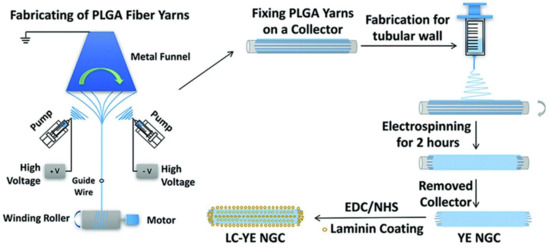 Figure 2. A schematic diagram of the fabrication of the laminin-coated and yarn-encapsulated PLGA (LC-YE-PLGA) nerve guidance conduit (YE NGC: yarn-encapsulated nerve guidance conduit; LC-YE NGC: laminin-coated and yarn-encapsulated nerve guidance conduit) [49]. Reproduced by permission of The Royal Society of Chemistry, 2017.