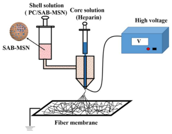 Figure 3. Process of fabricating the core (heparin)−shell (PC/SAB-MSN) fiber. Reprinted with permission from [57] Copyright (2018) American Chemical Society.