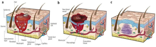 Figure 4. Classic stages of wound repair. There are three classic stages of wound repair: inflammation (a), new tissue formation (b), and remodeling (c) [59]. Reproduced with permission from Springer Nature, 2008.