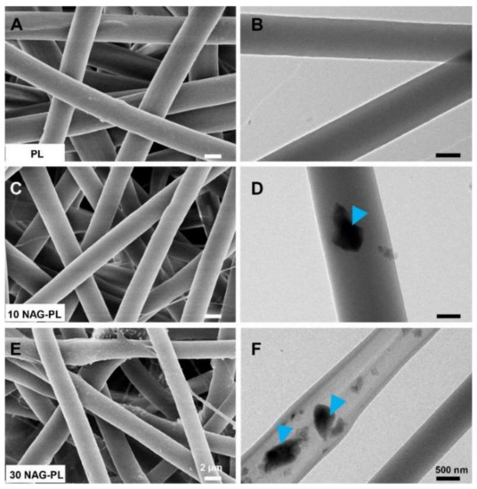 Figure 5. SEM (A,C,E) and TEM (B,D,F) images of the composite electrospun scaffolds with different contents of NAG bioceramic particles: (A,B) pure polymer (PL); (C,D) polymer with 10% NAG bioceramic particles (10 NAG-PL); (E,F) polymer with 30% NAG bioceramic particles (30 NAG-PL). Blue arrows identify the NAG bioceramic particles which were well embedded inside polymer fibers [75]. Reproduced with permission from Elsevier, 2017.