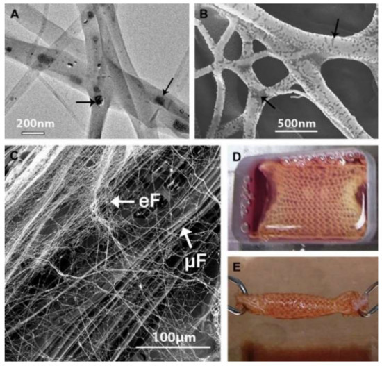 Figure 6. (A) TEM and (B) back-scattered SEM images of electrospun bFGF-containing PLGA fibers showing the random distribution of proteins (indicated by black arrows) in the fibers; (C) SEM image of biohybrid scaffold developed by coating FGF(+) electrospun fibers (eF) on microfibrous knitted silk scaffolds (mF); (D,E) BMSC-seeded biohybrid scaffold cultured in a custom-made chamber before being rolled up into cylindrical ligament/tendon analogs after seven days of culture [85]. Reproduced with permission from Elsevier, 2010.