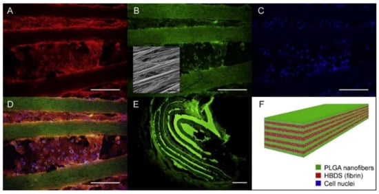 Figure 7. A representative HBDS/nanofiber scaffold with 11 alternating layers of aligned electrospun PLGA nanofiber mats separated by HBDS containing 1 × 106 ASCs is shown. (AD) Micrograph showing the HBDS/nanofiber scaffold in vitro; the PLGA is labeled with FITC (green), the HBDS is labeled with Alexa Fluor 546 (red), and the ASC nuclei are labeled with Hoescht 33258 (blue) (scale bar = 200 μm). (B, inset) SEM image of the scaffold showing PLGA nanofiber alignment. (E) Micrograph showing the HBDS/nanofiber scaffold in vivo nine days after implantation in tendon repair. Eleven alternating layers of PLGA and HBDS can be seen (i.e., six layers of PLGA and five layers of fibrin); the PLGA is labeled with FITC (green) (scale bar = 100 μm). (F) A schematic of the layered scaffold is shown [86]. Reproduced with permission from Elsevier, 2013.