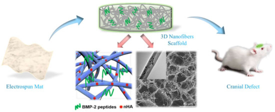 Figure 9. Three-dimensional (3D) electrospun nanofibrous scaffold for rat cranial bone regeneration [23]. Reproduced with permission from Elsevier, 2019.