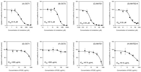 To investigate the herb–drug interaction potential between RGE and metformin, the inhibitory effect of RGE on the cationic transporter-mediated metformin uptake was measured. We firstly measured the uptake of 10 µM [14C]metformin in the presence of cimetidine, a representative inhibitor of OCT1, OCT2, MATE1, and MATE2-K [33,34].