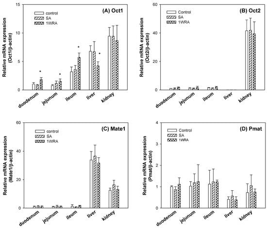 The mRNA expression of organic cation transporter 1 (Oct1) (A), Oct2 (B), multiple toxin and extrusion protein 1 (Mate1) (C), and plasma membrane monoamine transporter (Pmat) (D) in the duodenum, jejunum, ileum, liver, and kidney of rats in control, single RGE treatment (SA), and 1-week repeated RGE administration (1WRA) groups. Bars represent mean ± SD of three independent analyses; * p < 0.05 compared with control group (by Student’s t-test).