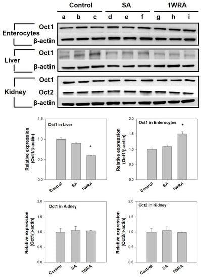 Protein expression of organic cation transporter 1 (Oct1) in the ileal enterocytes, liver, and kidney and Oct2 in the kidney of rats in control (lanes a, b, and c), single RGE treatment (SA, lanes d, e, and f), and 1-week repeated RGE administration (1WRA, lanes g, h, and i) groups and β-actin was used as a loading control. Quantitative analysis of western blot results is shown in the lower panel. Bars are mean ± SD of three independent densitometric analyses; * p < 0.05 compared with control group (by Student’s t-test).
