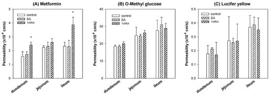 For the comparison, we also measured the permeability of 3-O-methyl-d-glucose, a marker compound of glucose transporters [32], in the duodenum, jejunum, and ileum. As results, the absorption of 3-O-methyl-d-glucose was much higher than that of metformin in all intestinal segments but not affected by the single or multiple treatment of RGE (Figure 4B). The permeability of Lucifer yellow, a marker compound for cell integrity and paracellular permeability [31,35], was not altered in rats of SA and 1WRA group (Figure 4C). The results suggested that the absorption of metformin from the duodenum and ileum was enhanced by the repeated administration of RGE without altering the absorption of glucose and cell integrity, which could consequently cause the increased absorption and plasma concentrations of metformin, including Cmax and AUC value.