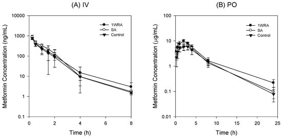 Plasma concentration-time profile of metformin in control, single administration of RGE (SA), and 1-week repeated RGE administration (1WRA, 1.5 g/kg/day) group following intravenous injection (IV) of metformin at a dose of 0.25 mg/kg (A) and oral administration (PO) of metformin at a dose of 50 mg/kg (B) Data points represent the mean ± SD from five different rats per group.