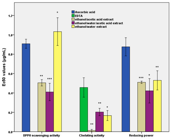 Figure 1 depicts the in vitro antioxidant activity of all the three extracts. These determinations revealed that the capacity of the extracts to respond via biological activities is directly dependent upon the presence of the principal compound. The results also demonstrated the lowest EC50 value for the ethanol/water/acetic acid extract. Further, from the Figure it is evident that the antiradical activity was the lowest with an EC50 of a maximum of 1 μg/mL when ethanol/water was used as the solvent. By contrast, this value was around 50% higher than when an acidic extracting medium was used (Figure 1).