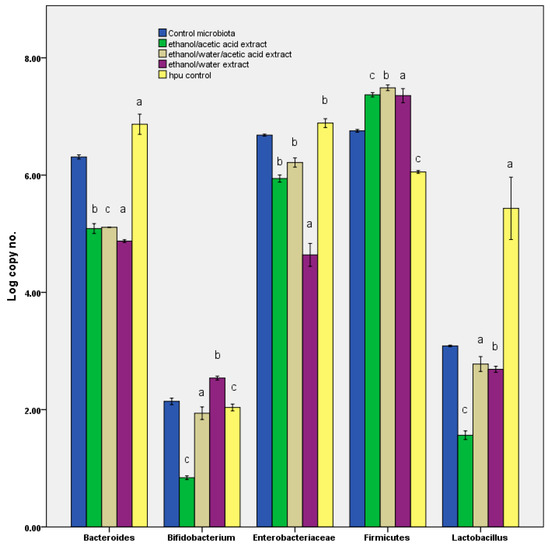 At gram-positive bacteria for phylum Firmicutes, which is also the dominant group from the microbiota, the number of cells is higher than control (107 genomes/mL), but it is constant among the samples, instead the dynamics within this phylum is different. Therefore, the number of microorganisms in the Lactobacillus-Lactococcus-Pediococcus group is approximately 10 times higher in the ethanol/water extract and ethanol/water/acetic acid extract samples than in the ethanol/acetic acid extract. The number of bifidobacteria is also higher in the first two samples analyzed in the ethanol/water extract and ethanol/water/acetic acid extract.