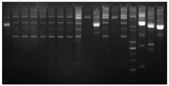 Dilutions from each sample were cultured on the MRS + CaCO3 plates for 48 h at 37 °C. Five colonies were randomly selected from the plate and cultivated in 1 mL MRS broth for 24 h at 37 °C. The cultures were centrifuged for 5 min at 10,000× g, followed by a one-time wash with sterile distilled water (SDW) with subsequent resuspension in 400 µL SDW, and frozen for 1 h at −70 °C. The PCR Master Mix (Promega, Madison, WI, USA), 0.2 µM of the primers (5’-CTG CTG CGT CTG CTG-3’), and 1 µL of the lysate culture were introduced in a 25 µL PCR reaction. The PCR amplifications were done in Mastercycler Nexus (Eppendorf, Hamburg, Germany). The amplification programme involved initial DNA denaturation for 7 min at 95 °C, 30 cycles of DNA denaturation for 1 min at 94 °C, annealing for 1 min at 53 °C, an extension for 8 min at 65 °C, and a final incubation for 16 min at 65 °C.