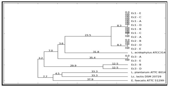 The genetic profiles were analyzed with PyElph 1.4 using the WPGMA clustering method. L. plantarum ATCC 8014, E. faecalis ATCC 51299, Lc. lactis subsp. lactis DSM 20729, and L. acidophilus ATCC 314 were used as the reference strains [21].