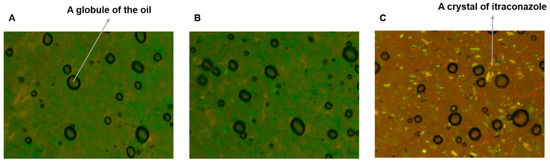 Images of the (A) O/W cream base devoid of ITZ, (B) O/W cream formulation of ITZ, and (C) physical mixture observed using a polarized light microscope at 100× magnification.