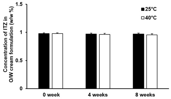 The result of the stability test of the O/W cream formulation of ITZ is illustrated in Figure 3. The concentration of ITZ in the O/W cream formulation was not considerably changed at 25 °C and 40 °C during the 8-week test period. No appreciable phase separation was observed from the O/W cream formulation of ITZ throughout the test period. This implies that ITZ solubilized in the O/W cream formulation was stable and the dispersion stability of the O/W cream formulation was appropriately retained for the whole tested period. The pH of the O/W cream formulation of ITZ remained unchanged (pH 6.0) under the test temperature condition for 8 weeks. The organoleptic characteristics and texture of the O/W cream formulation also did not change significantly during the test period. Thus, the O/W cream formulation of ITZ was found to be stable under the experimental conditions.