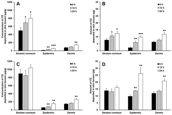 The deposited concentration of ITZ per gram tissue (A,C) and deposited amount (B,D) of ITZ in the stratum corneum, epidermis, and dermis evaluated with the physical mixture (A,B) and O/W cream formulation (C,D). The data are expressed as the mean ± SD (n = 4). Single, double, and triple asterisks denote statistical differences at P < 0.05, P < 0.01, and P < 0.001, respectively, between the concentration and amount of ITZ deposited in each skin tissue at 6 h and those at 12 h and 24 h.