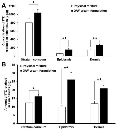 Figure 4 shows the deposition profiles of ITZ in the stratum corneum, epidermis and dermis assessed for 24 h after the start of the in vitro skin deposition analysis performed with the O/W cream formulation and physical mixture. In general, the concentration and amount of ITZ deposited in the skin tissues gradually increased with time, and they were the highest in the stratum corneum, followed by those in the dermis and epidermis. This implies that the drug formulated in the cream formulation and physical mixture was initially delivered to the outermost skin tissue, i.e., the stratum corneum and then diffused into deeper skin tissues such as the epidermis and dermis with time. In addition, keratins abundantly present in the stratum corneum are known to have high binding affinity to lipophilic drugs such as ITZ, and thereby they act as drug reservoirs [22,23,24,25,26]. For this reason, most of ITZ deposited in the stratum corneum were supposed to be bound to keratins and only remaining drugs were diffused into deeper skin tissues, resulting in considerably higher concentration and amount of the drug in the stratum corneum than those in the epidermis and dermis.