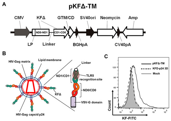 Flagellin, a principal component of bacterial flagella, is a virulence factor that is recognized by the immune system via the toll-like receptor 5 (TLR5) pathway [11]. An increasing number of studies have demonstrated the effectiveness of flagellin as an adjuvant as well as its ability to promote cytokine production by a range of innate immune cell types. Moreover, it triggers the recruitment of T- and B-cells to secondary lymphoid sites and activates dendritic cells (DCs) and T lymphocytes [12]. Using inorganic nanoparticle B-cell-targeting vaccines functionalized with a model antigen, hen egg lysozyme (HEL), we demonstrated that additional functionalization with flagellin improves antibody responses against HEL in mice [13]. To avoid the high antigenicity of flagellin and the dose-related inflammatory injury induced by flagellin in mice [14,15] we selected a truncated form of nonpathogenic Escherichia coli K12 strain-derived flagellin (KF) in which the main antigenicity region (i.e., domains ND2–D3–CD3) was replaced by HIV-1 p24 antigen. The truncated form induced less systemic inflammatory responses and KF-specific antibodies as well as abrogated detectable inflammatory side effects on mice, but kept the adjuvant properties of KF [16]. Here, we generated a membrane-bound form of truncated flagellin (KFΔ) and investigated whether functionalization of HIV-based VLP’s with KFΔ has an adjuvant effect on the immune stimulatory capacities of virus-based nanoparticle B-cell vaccines.
