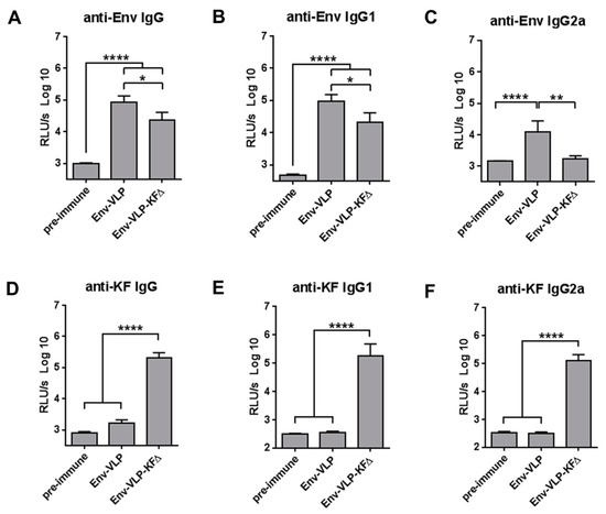 Unpredictably, the KFΔ functionalization significantly decreased anti-Env Ab levels of total IgG and IgG1 subclass (Figure 3A,B) levels and totally abrogated induction of IgG2a (Figure 3C), the predominant antiviral IgG antibody subclass in the mouse [23]. To exclude that the KFΔ functionalization only transiently decreases antibody responses, mice were immunized three times and a serological follow-up over 11 weeks was performed. Anti-HIV-Env-specific IgG antibody levels induced by Env-VLP-KFΔ immunization continued to be lower than in Env-VLP immunized mice (Figure A2). Then, we measured the immunogenicity of KFΔ and observed strong induction of anti-KF-specific antibodies with equally strong production of both IgG1 and IgG2a antibodies (Figure 3D–F).