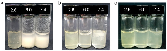 Solubility of (a) CS, (b) WCS30, and (c) WSCS90 at different pHs (2.6, 6.0, and 7.4).