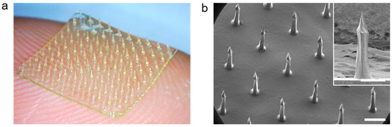 Recently, microneedle (MN)-assisted TDDSs have been widely investigated as they could create micron-sized holes, which provide a direct channel of mass transport regardless of drug type. Depending on the type of drug formulation and desired pharmacokinetic response in a body, numerous MN arrays had been fabricated in various sizes and geometries with diverse materials [19,20,21,22]. Although metal MNs prepared using silicon or ceramics can enhance the permeability of skin [23,24], complicate fabrication procedures employing conventional lithography, poor drug loading capacity, and health hazards arising from the breakage of these materials are limitations [25,26].
