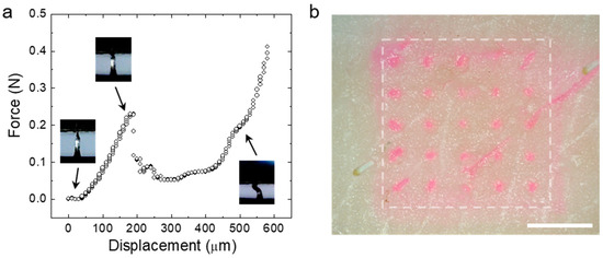 (a) The force displacement profile obtained from the axial compression test of the single CS MN. Snapshot images showing the response for the CS MN corresponding to the displacement point. (b) The photo image of the pig skin after the insertion test using the rhodamine dye-loaded CS MN array (Scale bar; 2 mm).