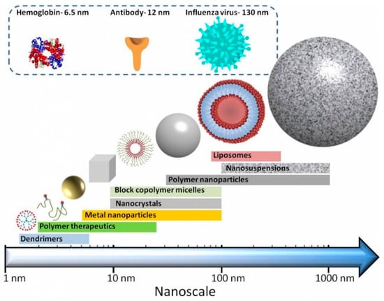 Cartoons of nanomedicines and their approximate sizes compared to various biological molecules (reproduced with permission from the British Society for Nanomedicine: https://www.britishsocietynanomedicine.org/what-is-nanomedicine/ (accessed on 10 October 2018)). Note that lipid nanoparticles can vary in size from 50–1000 nm.