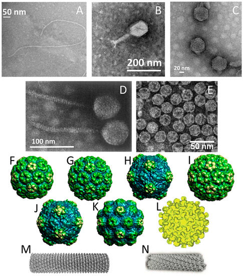 Structures of the viruses discussed in this review. Transmission electron microscopy (TEM) images of (A) M13 phage, (B) T4 phage, (C) T7 phage, (D) λ (lambda) phage, and (E) MS2 phage. (TEM Images were acquired by the authors, except for λ phage (reprinted with permission from [36], Copyright Elsevier, 1968) and TEM image of MS2 phage (reprinted with permission from [37], Copyright The Royal Society of Chemistry, conveyed through Copyright Clearance Center, Inc., 2011). Structures of plant viruses (F) brome mosaic virus (BMV), (G) cowpea chlorotic mottle virus (CCMV), (H) cowpea mosaic virus (CPMV), (I) cucumber mosaic virus (CMV), (J) red clover necrotic mosaic virus (RCNMV), (K) turnip yellow mosaic virus (TYMV), (L) hibiscus chlorotic ringspot virus (HCRSV), (M) tobacco mosaic virus (TMV), and (N) PVX. (Images of the following viruses were obtained from the VIPERdb (http://viperdb.scripps.edu/) [38]: BMV, CCMV, CPMV, CMV, RCNMV, TYMV. The image of HCRSV was reprinted with permission from [39], Copyright Elsevier, 2003. The image of TMV was reprinted with permission from [40], Copyright Elsevier, 2007. The image of PVX was reprinted with permission from [41], Copyright Elsevier, 2017).