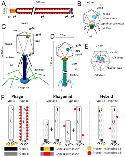 Assembly of coat proteins on bacteriophage (A) M13, (B) T7, (C) T4, (D) λ (lambda), and (E) MS2 (Images of M13, T7, T4, and λ (lambda) phages were adapted with permission from [89], Copyright American Chemical Society, 2015. The image of MS2 phage was adapted with permission from [90], Copyright the PCCP Owner Societies, 2010). (F) Schematic of M13 phage display systems; phage system (type 3/8), phagemid system (type 3+3/8+8), and hybrid system (type 33/88) (The image was adapted with permission from [88], Copyright Elsevier, 1993).