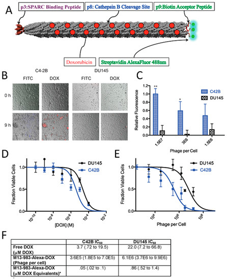 (A) Schematic of M13-983 Phage. The red dots along the phage coat represent doxorubicin (DOX) attached to p8. p3 displays a peptide with affinity for SPARC (Secreted Protein, Acidic and Rich in Cysteine), and p9 can be enzymatically biotinylated and loaded with streptavidin-functionalized fluorophores AlexaFluor 488 nm. (B) Overlay of brightfield and fluorescent images of SPARC positive C42B cells (first and second column) and less expressing SPARC DU145 cells (third and fourth column) incubated with M13-983-Alexa-DOX at 0 h (top row) and 9 h post-treatment (bottom row). FITC channel represents fluorescence from Alexa Fluor 488, and DOX is designated by red fluorescence from DOX uptake. C42B samples showed increased fluorescence of phage uptake, indicated by green fluorescence (bottom row, first column) and DOX uptake (bottom row, second column) as compared to DU145 cells after 9 h. (C) Targeted uptake measured by quantifying fluorescence intensity (** p < 0.001; * p < 0.01). C42B consistently shows higher fluorescence intensity than DU145, confirming the observations in panel B. Higher phage concentrations report larger differences between C42B and DU145 fluorescence. (D) Cell viability of C42B and DU145 as a function of free DOX. (E) Cell viability of C42B and DU145 cell lines as a function of increasing M13-983-Alexa-DOX. All samples were run in triplicate and error bars represent standard deviations. (F) IC50 values for C42B and DU145 are given with the 95% confidence interval given in parenthesis. *Based on 257 DOX particles per phage (Adapted with permission from [84], Copyright American Chemical Society, 2012).