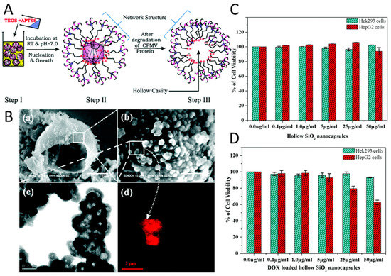 (A) Schematic representing the proposed synthesis mechanism of the CPMV-templated mesoporous silica nanocapsules in three steps (Step I, Step II and Step III). (B) (a) SEM image of single hollow capsules formed through the self-assembly of hollow SiO2 nanocapsules synthesized in the presence of CPMV, (b) surface textures of the same formed by the self-assembly of nanoparticles. (Scale bar 10.0 μm and 1.0 μm, respectively), (c) TEM of hollow SiO2 nanocapsules (shown in (b), scale bar 0.2 μm), and (d) confocal microscopy image of hollow SiO2 nanocapsules loaded with Rh6G (a small fluorescent molecule) (scale bar 2 μm). Cytotoxicity assay of Hek293 (Human embryonic kidney cell line) and HepG2 cells (Human carcinoma cell line) (C) with mesoporous SiO2 nanocapsules free from drugs and (D) nanoformulated hollow SiO2 nanocapsules (doxorubicin (DOX)-loaded hollow SiO2 nanocapsules) of different doses (Adapted with permission from [223], Copyright The Royal Society of Chemistry, 2015).