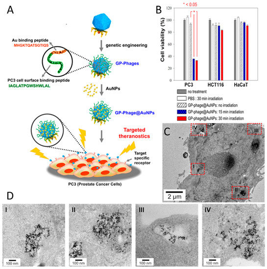 (A) Schematic illustration of cancer-selective photothermal therapy via prostate cancer-targeted intracellular delivery of T7-templated AuNP nanoclusters, where T7 phages are genetically modified to display gold-binding and prostate cancer cell-targeting peptides on the viral surface. (B) The viability of each cell line (prostate cancer cell (PC3), human colorectal carcinoma cells (HCT116), and normal cells (HaCat)) by photothermal effects of T7-templated AuNP nanoclusters. (C,D) TEM images of T7-templated AuNP nanoclusters internalized within PC3 cells in ultrathin section specimens. The cells were treated with T7-templated AuNP nanoclusters for 5 h, followed by medium replacement and additional incubation for 20 h (Adapted with permission from [206], Copyright American Chemical Society, 2015).