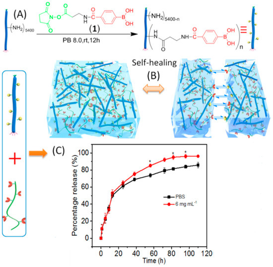 Schematic representing (A) the preparation of viral bioconjugates of M13 viruses with low-pKa phenylboronic acid derivative (PBA-M13) and (B) fabrication of dynamic hydrogels via binding of PBA-M13 with multiple diol-containing polymers and demonstration of self-healing behavior. (C) Glucose responsiveness-regulated insulin release behaviors. FITC-insulin was loaded into the hydrogel and then placed into PBS buffer with or without glucose. The released FITC-insulin was monitored by fluorescent measurements. The asterisks represent the statistical significance, which is calculated by multiple t tests-one per row: * p < 0.05, ** p < 0.01, *** p < 0.001. The hydrogels consist of 1 wt % PBA-M13 and 0.15 wt % PVA (Adapted with permission from [237], Copyright American Chemical Society, 2018).