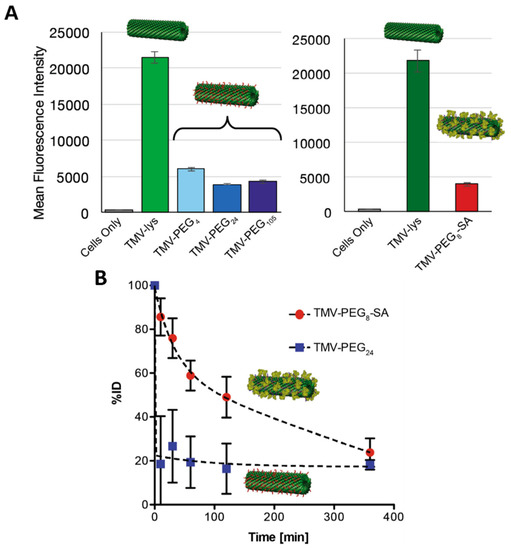 The studies above suggest that the fast blood clearance of viral particles are at least partially due to the host immune response and highlight a need for a coating to tailor the properties of the viral particles for enhanced blood circulation times. For this, the modification of the viral capsid with passivating agents, such as polymers or proteins, has been investigated. For instance, the modification of the CPMV capsid with poly(ethylene glycol) (PEG) effectively blocked CPMV–cell interactions and shielded the viral particles from inducing a primary antibody response [248,249]. The effect of PEGylation has been also observed on plasma circulation times. The half-lives of PEGylated CPMV and TMV particles were 20.8 min and 6.6 min, respectively, which were longer than the half-lives mentioned above [22,250]. In addition to PEG, poly(2-oxazoline) (POx) and serum albumin have also been employed as alternative coatings agents [251]. In comparison to PEGylated TMV, POx-coated viruses showed lower cellular uptake rates indicating less favored TMV–cell interactions due to the higher polymer grafting density of Pox relative to PEG for the tested samples. High polymer density was associated with a reduction in cellular recognition as well as protein adhesion to the polymer-coated particles. On the other hand, pharmacokinetic studies showed a two-phase decay for the polymer-coated TMV particles. During the initial clearance period, POxylated TMV particles had longer plasma half-life (11.3 min) than PEGylated TMV particles (0.01 min) indicating better screening capability of POx polymer. Serum albumin (SA) has been another coating material investigated to shield TMV particles from the immune system. Similar to POx, in cellular uptake and pharmacokinetic studies of the SA coating also outperformed the PEG [252]. While the rates of macrophage uptake of PEG- and SA-coated TMV particles were comparable, showing a 4-fold reduction in macrophage-particle interactions relative to uncoated TMV particles (Figure 8A), their circulation half-lives in Balb/C mice were 10 min and 100 min, respectively (Figure 8B). According to the authors, the enhanced pharmacokinetics of SA coating was associated with its relatively high molecular weight. It was suggested that compared to flexible PEG chains with low molecular weight, the globular and rigid structure of SA provided enhanced steric hindrance, resulting in better stealth properties.