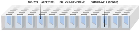 The screening experiments were conducted in prototypes of a novel two-compartment microtiter plate system, which were kindly provided by InnoMe GmbH (Espelkamp, Germany). The top-plate of the microtiter plate system comprised an integrated dialysis membrane consisting of cellulose hydrate. The screening experiments were conducted according to the following general procedure: 300 µL of the freshly dispersed formulations were transferred to the bottom-plate (n = 3–6) and 200 µL of acceptor medium (surfactant solution or phosphate buffer) was placed in the top-wells of the plate. The top-plate was sealed with pierceable, adhesive sealing foil (x-Pierce™, Excel Scientific, Inc.) and closed with the corresponding lid. The set was incubated at room temperature under shaking (300 rpm) with an orbital shaker. During the incubation, tadalafil permeated from the bottom-wells (i.e., donor compartment), to the top-wells (i.e., acceptor compartment). After either 1, 3 or 6 h of incubation, samples were withdrawn from both, the donor and the acceptor compartments. The samples from the acceptor compartments (140 µL) were diluted 1:1 with acetonitrile for UHPLC-UV analysis. To separate the dissolved drug from the non-dissolved solid material, the samples from the donor compartments (complete well volume) were transferred to micro-centrifuge tubes and centrifuged for 60 min at 14,000 rpm (19,500× g) and 25 °C using an Eppendorf Centrifuge 5804 R (Eppendorf AG, Hamburg, Germany). The supernatant was diluted 1:1 with acetonitrile for UHPLC-UV analysis. Quantification of tadalafil was then conducted via UHPLC-UV as described in Section 2.2.7. The tadalafil concentration in the donor- and acceptor compartment, that is, the dissolved and permeated concentrations, were used to compare the screening parameters and to establish an in vitro in vivo correlation. The in vitro in vivo correlation was established by comparing to literature data [26].