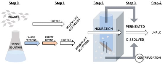 Figure 2 shows a flow-diagram of the complete high-throughput dissolution/permeation screening procedure including preparation of the formulation, where applicable (See Section 2.2.3), the dissolution/permeation experiments (described in this section) and the quantification of tadalafil (See Section 2.2.7).