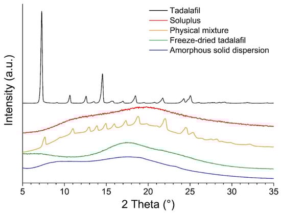 The solid state of tadalafil, Soluplus®, freeze-dried tadalafil and the tadalafil amorphous solid dispersion was investigated by X-ray powder diffraction (XRPD) using a Rigaku®, MiniFlex 600 with Cu Kα radiation (l = 1.5418 Å) (Tokyo, Japan). For this, freeze-dried tadalafil and tadalafil amorphous solid dispersion were prepared in larger batches to fill the sample holder with a diameter of 2 cm. The up-scaled batches were prepared as described in Section 2.2.3. with slight modifications: a 16 mg/mL Soluplus® solution was used and tadalafil and the amorphous solid dispersion were freeze dried in 100 and 30 mL vials, respectively. The XRPD analysis was carried out with a scanning rate of 1 °/min in 2θ, a step width of 0.02° over the range of 5–35°. The current was 10 mA and the voltage 30 kV.