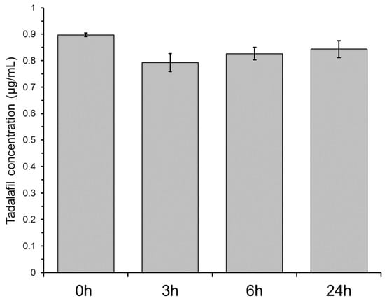 Non-specific adsorption of tadalafil to the plastic material of the two-compartment microplate system shown as the tadalafil concentration in the bottom-well after 3, 6 and 24 h incubation of a 0.9 µg/mL tadalafil solution. ‘0 h’ indicates the ‘unincubated’ (start) concentration. Data shown as mean ± SD of six replicates.