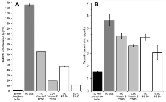 Tadalafil concentration in (A) the donor compartment or (B) the acceptor compartment after 6 h of incubation using different media for dispersion of the formulations. The acceptor medium was 1% Vitamin E TPGS in the respective dispersion medium. Data shown as mean ± SD of four replicates.