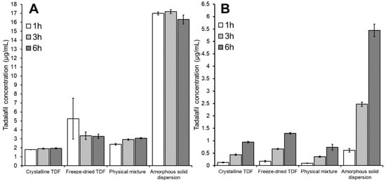 Figure 6 gives the tadalafil concentration in the donor compartment (Figure 6A) and acceptor compartment (Figure 6B) after 1, 3 and 6 h of incubation. Here, tadalafil formulations were dispersed in phosphate buffer.