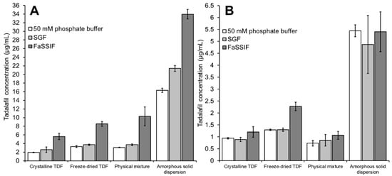 Krupa and co-workers conducted a dissolution study on similar (ball-milled) formulations using a paddle dissolution apparatus [26]. In this study, 500 mL of SGF (pH 1.2) or phosphate buffer (pH 7.4) were used as dissolution medium. After 6 h, approximately 3, 4.5, 16.6 and 24 µg/mL were reached in SGF for the dissolution of crystalline tadalafil, amorphous tadalafil, physical mixture and amorphous solid dispersion, respectively. In phosphate buffer, approximately 3, 4, 4.7 and 21 µg/mL were reached after 6 h for the same formulations.