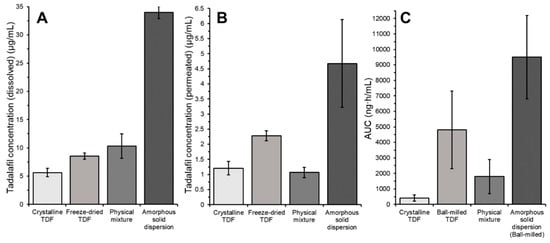 Tadalafil concentration in (A) the donor compartment (dissolved) or (B) the acceptor compartment (permeated) and (C) in vivo AUC after oral gavage to rats taken from [26].