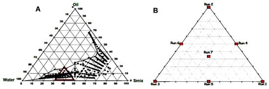 Pseudo ternary phase diagram showing nanoemulsion region (A) and distribution for each of run in a mixture design (B).